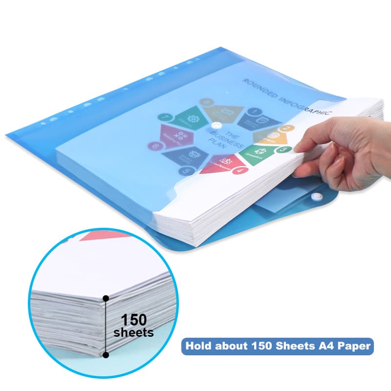 Our loose-leaf file folders, crafted from 0.18mm ultra-durable PP, use hot pressing technology for strong edge sealing. They're durable, waterproof, stain-resistant, and keep docs flat and moisture-free.