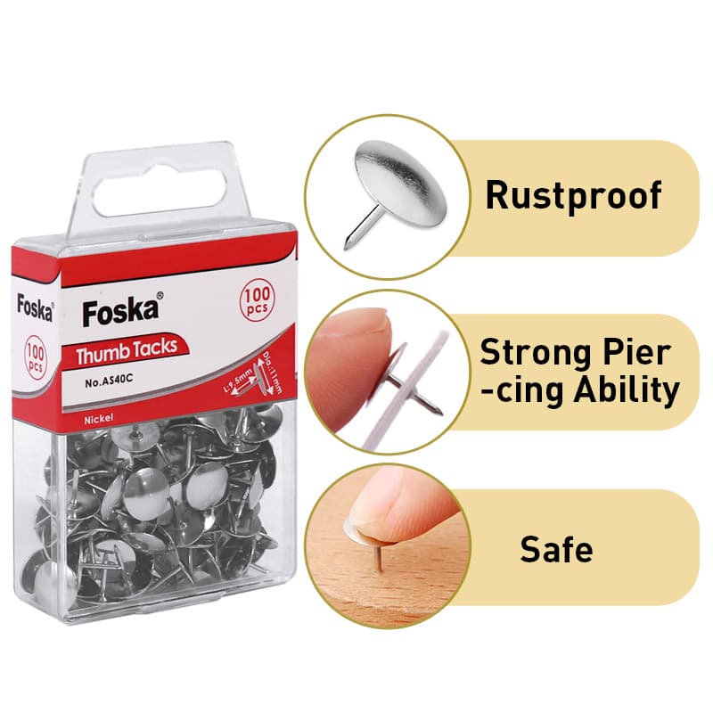 Nuestro premium chinchetas niqueladas Fabricadas con acero resistente y un acabado de níquel liso antioxidante, ofrecen durabilidad y resistencia a la corrosión para el uso diario en la oficina. Cada chincheta cuenta con una punta afilada y precisa para una fácil inserción en tablones de corcho, paneles de anuncios, paneles de madera y paredes de cubículos, mientras que la cabeza plana y redonda sujeta firmemente documentos, notas, fotos, carteles y mapas sin que se deslicen ni dañen el papel.