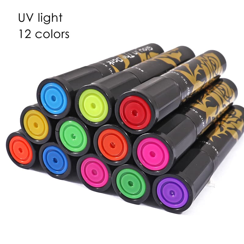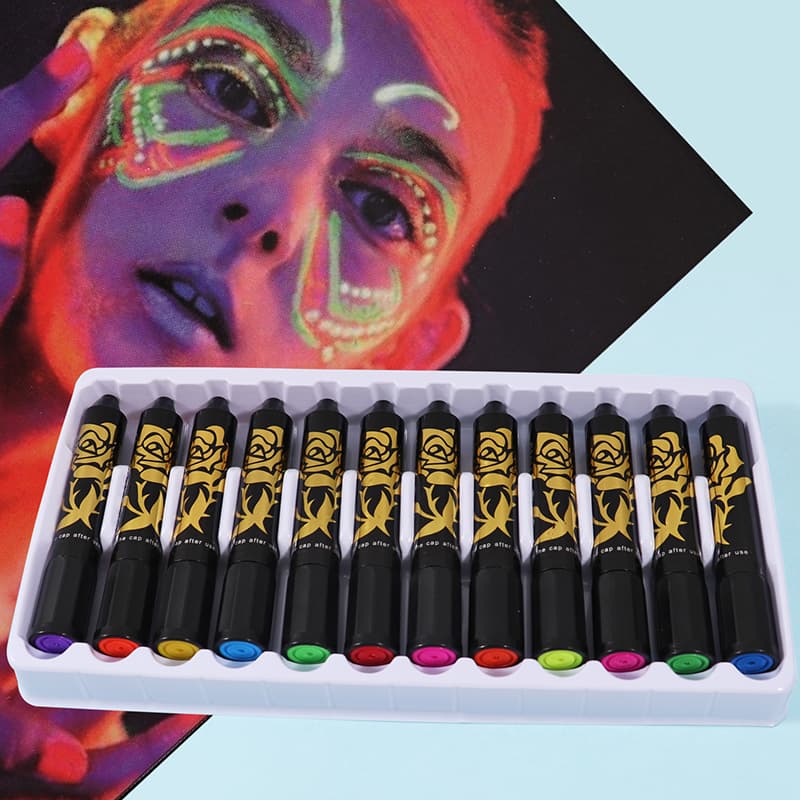 Transforma looks comunes en gafas llamativas con nuestras gafas profesionales Pintura facial con luz ultravioletaLa opción definitiva para quienes buscan destacar en fiestas, festivales, Halloween o presentaciones. Diseñada para brillar intensamente bajo la luz negra, esta fórmula de alta pigmentación brinda una luminosidad intensa de color neón que llama la atención y genera conversación, a la vez que es suave para todo tipo de piel.